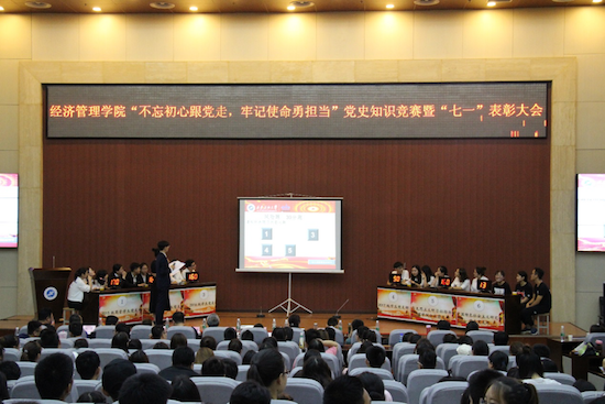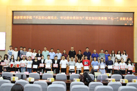 在“七一”黨的生日來臨之際,為進一步激發青年學生熱愛祖國、永遠跟黨走的民族情懷,培養學生社會主義核心價值觀,引導學生健康成長成才,讓學生學黨史、知黨章,做合格黨員,6月27日下午,由經濟管理學院黨委主辦,學生黨建工作辦公室承辦的“不忘初心跟黨走,牢記使命勇擔當”黨史知識競賽暨“七一”表彰大會在鄠邑校區弘石學術報告廳舉行。經濟管理學院黨委書記閆大維,副書記趙海濤,副院長吳勛、張帆,教工黨支部書記董春詩、王小鵬出席,教工黨員代表、各年級輔導員以及學生黨員、入黨積極分子代表近400人參加。