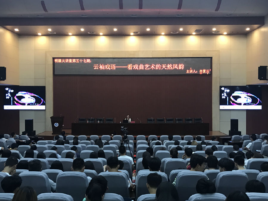 6月14日晚,由校團委主辦,人文學院團委承辦的第五十七期明德大講堂《云袖戲語——看戲曲藝術的天然風韻》在鄠邑校區圖書館弘石學術報告廳成功舉辦。著名秦腔藝術家齊愛云女士應邀擔任主講,鄠邑校區400余名師生聽取了此次講座。