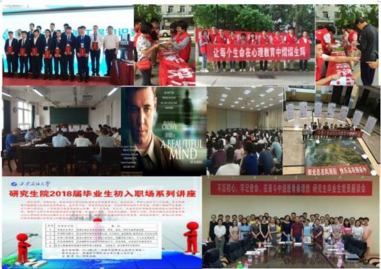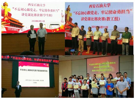 ——促進工作,堅持融合。在開展專題學習和落實三會一課制度中,研究生院黨委堅持以促進工作,學做融合為原則,要求研究生黨建工作為研究生學術實踐和穩定安全教育提供思想保證和動力支持。2018年5月至今,在各研究生黨支部積極帶動,研究生黨員模范帶頭下,研究生院超額完成互聯網+創新創業大賽報名工作,研究生在石油裝備創新設計大賽、研究生電子設計競賽、陜西省研究生創新成果展報名積極,并石油工程設計大賽等學科競賽中獲得全國二等獎2項、三等獎3項。在穩定安全教育中,充分發揮黨支部戰斗堡壘作用和研究生黨團骨干作用,結合研究生在學習生活中關注的熱點難點,開展研究生宿舍管理服務專題座談會;結合“525心理健康教育月”,開展宣傳倡議、印發手冊、現場咨詢、科普展覽、電影評析、問卷調查、主題講座等系列活動;結合畢業生文明離校,開展畢業生初入職場系列講座、畢業籃球賽、畢業生黨員座談會、主題征文等,進一步強化黨員身份意識,宗旨意識,切實增強黨員榮譽感,責任感,使命感,為進一步加強研究生思想政治教育和積極推進研究生黨建工作做出自身更大的貢獻。