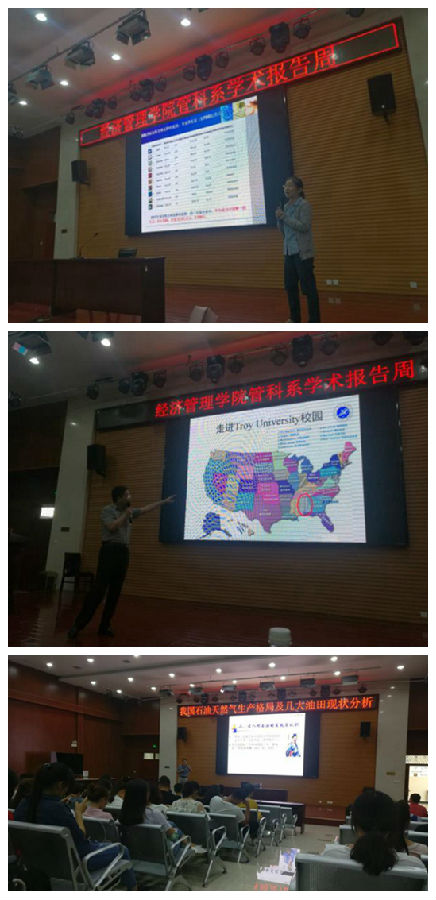第一場(chǎng)講座是由國(guó)家一級(jí)注冊(cè)建造師尹志國(guó)老師介紹了“BIM技術(shù)的發(fā)展現(xiàn)狀及應(yīng)用”;第二場(chǎng)講座是由電子商務(wù)專業(yè)帶頭人王小寧教授解讀了“石油行業(yè)中電子商務(wù)的應(yīng)用情況”;第三場(chǎng)講座是由李俊亭副教授講述了他在美期間的“訪學(xué)見(jiàn)聞”;第四場(chǎng)講座是由管科系主任杜小武副教授做了題為“我國(guó)石油天然氣生產(chǎn)格局及幾大油田現(xiàn)狀分析”的石油科普教育。