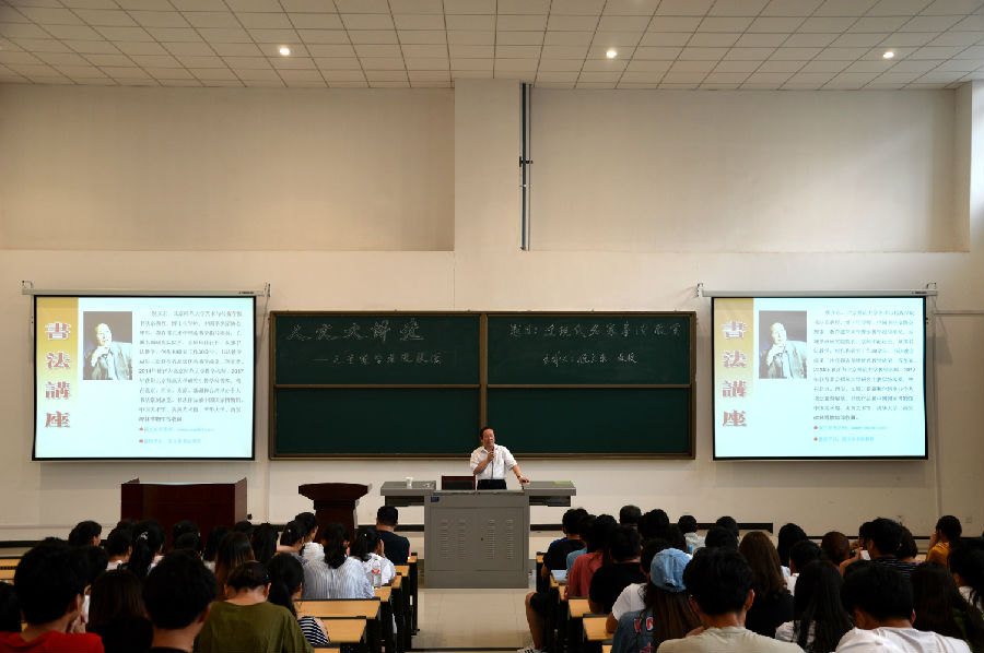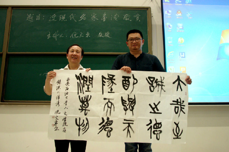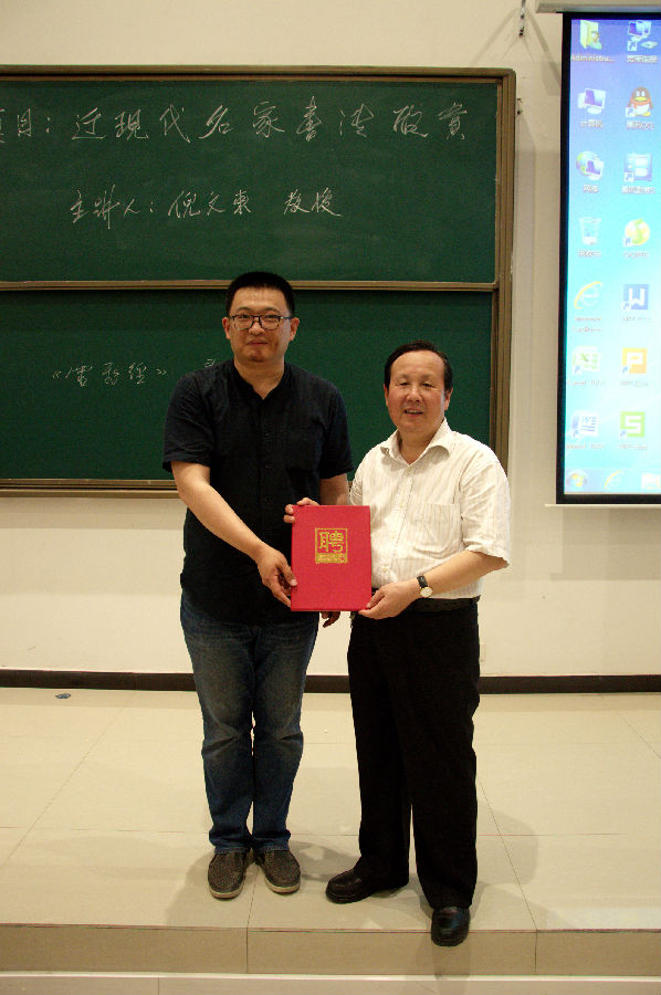 倪文東教授選取了于右任、李叔同、沈尹默、沙孟海、啟功等十位近現(xiàn)代書法名家,結合其生平事跡、學書經(jīng)歷分析了其書法造詣、枚舉了其書法創(chuàng)新特點、評價了其在中國書法史上的重要地位。倪教授認為書法非寫字,中國書法根植于博大精深的中國傳統(tǒng)文化,學書必要有深厚的學養(yǎng)、廣博的積淀再加以超乎常人的勤學苦練方可有所成就。倪教授告誡學子們,功夫在“書”外,學書要以提高自身的文化素質修養(yǎng)為前提。倪教授的講座深入淺出、詼諧風趣,贏得了老師、學生們的陣陣掌聲。