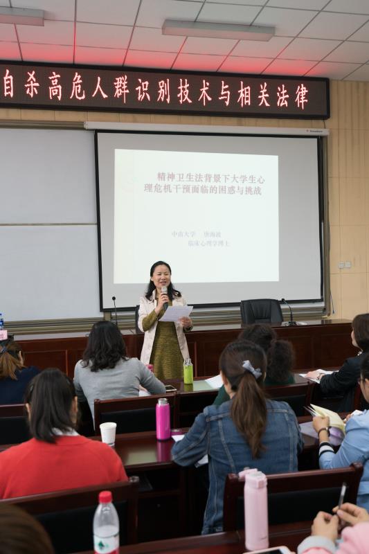 為提高我省各高校學工干部、心理咨詢專業(yè)人員的工作能力,提升大學生心理危機干預工作的科學性、規(guī)范性,我校特邀請中南大學唐海波博士作了題為?危機干預中的自殺高危人群識別技術與相關法律解讀?的專題培訓,這同時也是陜西普通高校心理健康教育培訓與研修基地舉辦的“2018年陜西省普通高校心理委員工作暨朋輩輔導論壇”的會前培訓。5月8日,來自省內的百余名教師參加了此次培訓,由西安石油大學學生心理成長指導中心主任、陜西省普通高校心理健康教育培訓與研修基地常務副主任肖瓊主持。