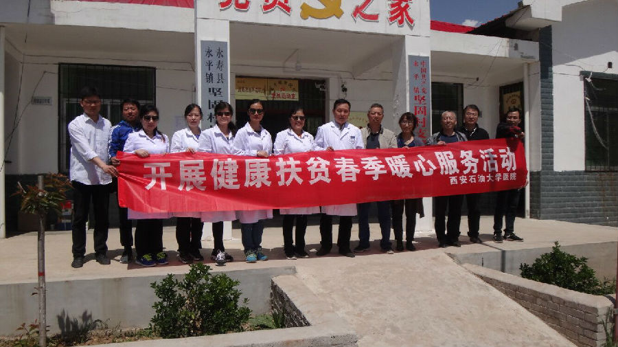 2018年4月27日,校醫(yī)院黨支部和工會(huì)組織醫(yī)療專家團(tuán)隊(duì),在院長(zhǎng)崔廣志帶領(lǐng)下,深入永壽堅(jiān)固村開展健康扶貧義診活動(dòng)。