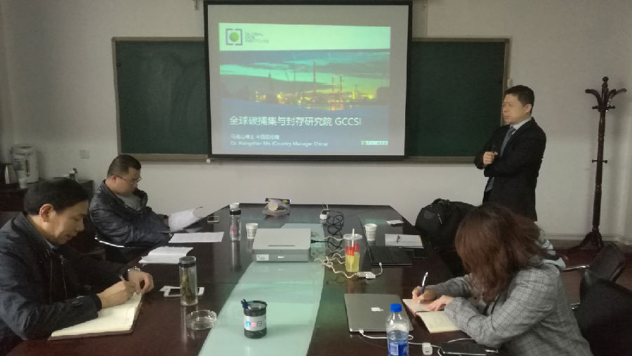 我院周德勝院長,楊昌華教授,黃海副教授,蔡文斌副教授與全球碳捕集與封存研究院馬經(jīng)理進行了座談,周院長對我院二氧化碳捕集利用與封存研究所成立目的、規(guī)劃、優(yōu)勢及能開展的相關研究進行了介紹。