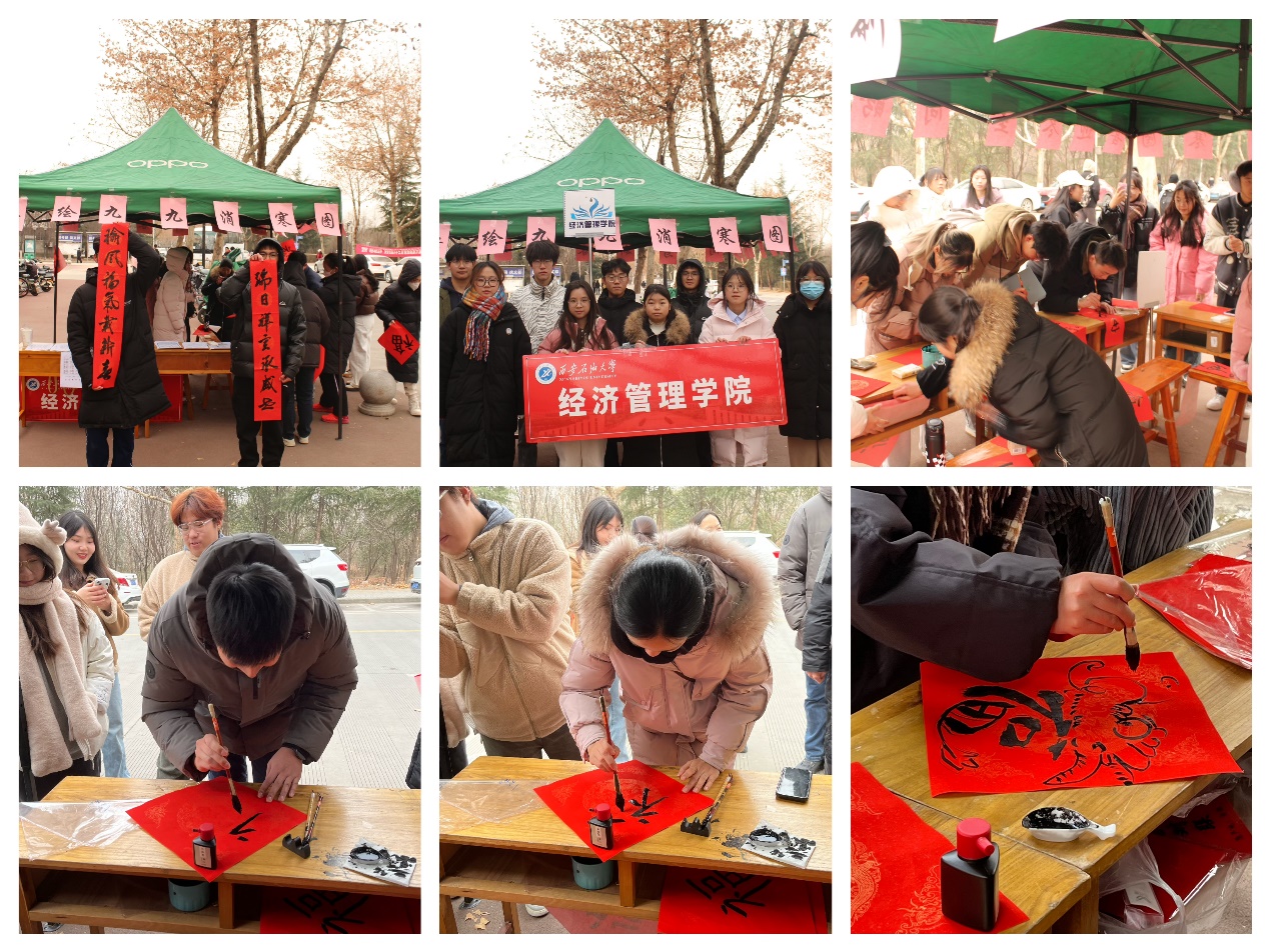 在新食堂外,學院舉辦了“共繪九九消寒圖”“書寫新春對聯”“寫福字”等活動。九九消寒圖始于明代,與數九的民俗密切相關,是中國民間一種計算寒天與春暖花開日期的方法。寫春聯、寫福字是中國傳統而獨特的文化,反映著中華民族文化底蘊的博大精深。學生們熱情參與,寫出一幅幅飽含吉祥寓意與祝福的春聯與福字,在翰墨飄香中感悟傳統文化。