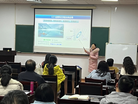接著,化工機械系老師唐春麗為全體老師講授“工程流體力學”課程思政示范課。唐春麗將民航事故、工程經驗和古詩詞融入教學中,通過15分鐘“深入淺出”的講解,將伯努利方程的物理意義完美的呈現在“聽眾”眼前。唐老師精湛的授課技藝獲得了老師們由衷的贊嘆。
