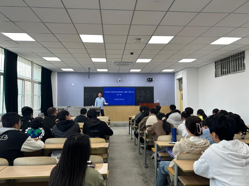 3月14日上午,理學院在鄠邑校區博思樓103教室舉辦了2024屆畢業生考研復試(調劑)指導大會。理學院黨委副書記馬小剛主講,2024屆輔導員林曄主持,理學院60余名學生參會。