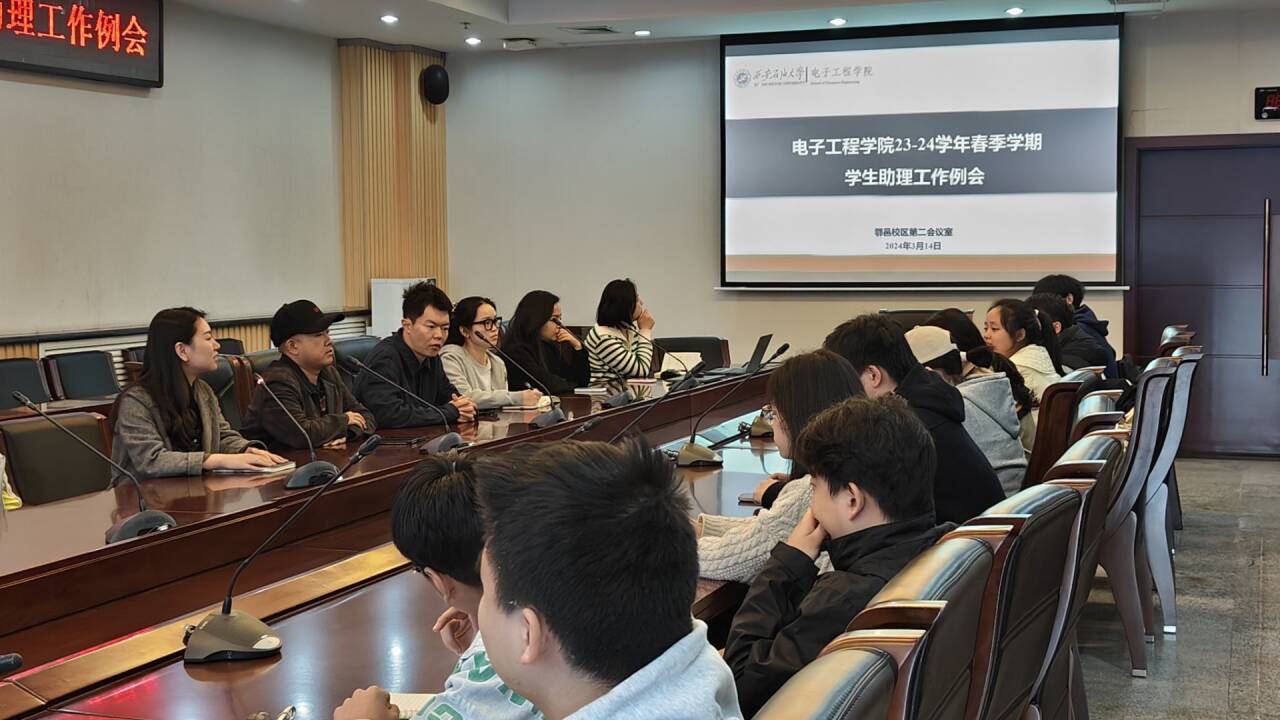 2024年3月14日中午,電子工程學院在鄠邑校區第二會議室召開23-24學年春季學期學生助理工作例會。會議由沈軒羽主持,學生工作辦公室主任錢宇航和各年級輔導員出席,全院學生助理47人參加本次會議。