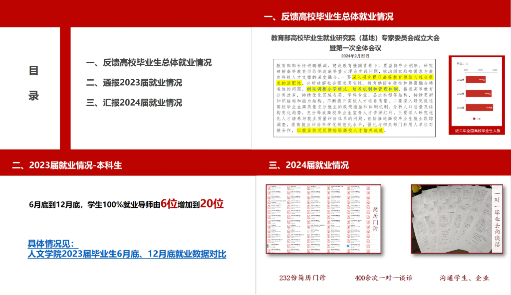 會上,黨委副書記盛丹帶領大家學習了教育部、教育廳關于畢業生就業文件精神,并分析全省高校畢業生總體就業情況,對2023屆畢業生就業去向落實過程進行分析,指出工作中存在的問題和主客觀原因。接著,她介紹了學院目前針對2024屆畢業生就業所做工作,詳細通報了目前學生的考研初試情況,并分專業展示了畢業指導老師所帶學生就業完成率,希望各位導師在督促學生完成畢業論文的同時,抓住畢業前的就業機會,盡早確定去向。