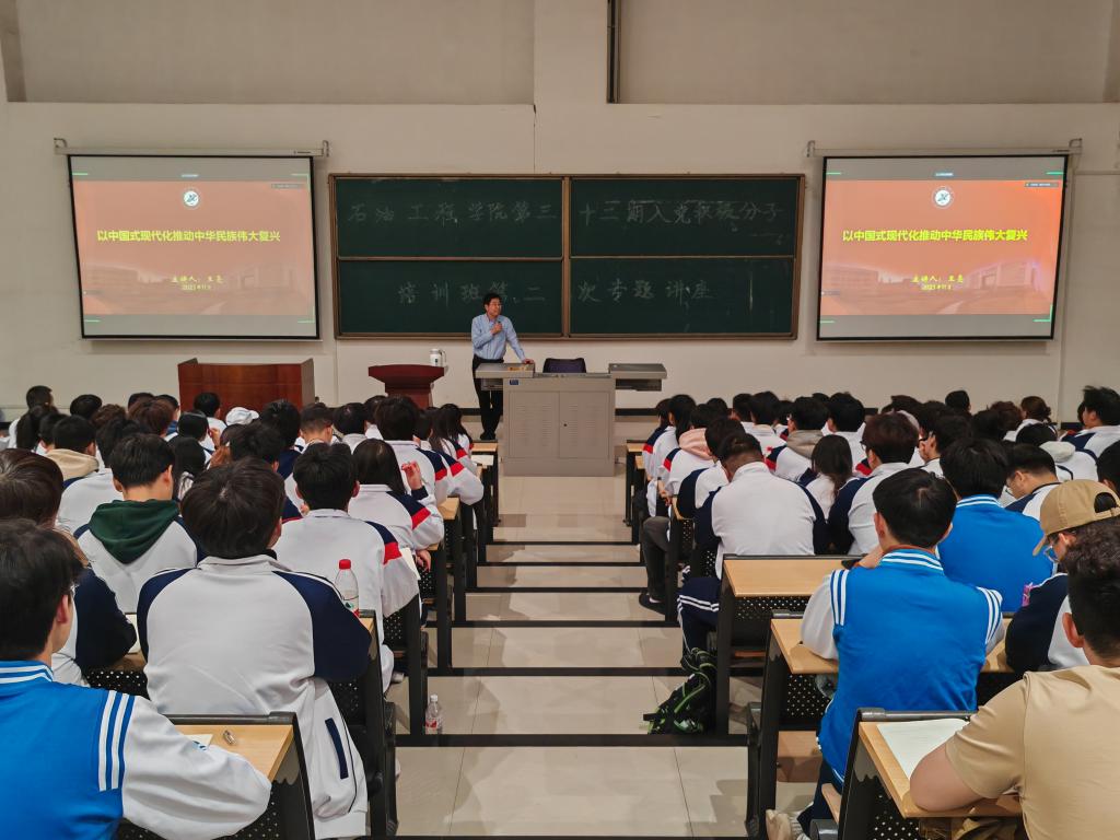 3月14日晚19:00,石油工程學院第三十二期入黨積極分子培訓班第二講在石工地科樓115教室順利進行。西安石油大學學生工作部(處)部(處)長、就業指導中心主任王亮作了題為“以中國式現代化推動中華民族偉大復興”的黨課培訓。本次黨課線上線下同步進行,石油工程學院共計200余名參訓學員參加了此次培訓。