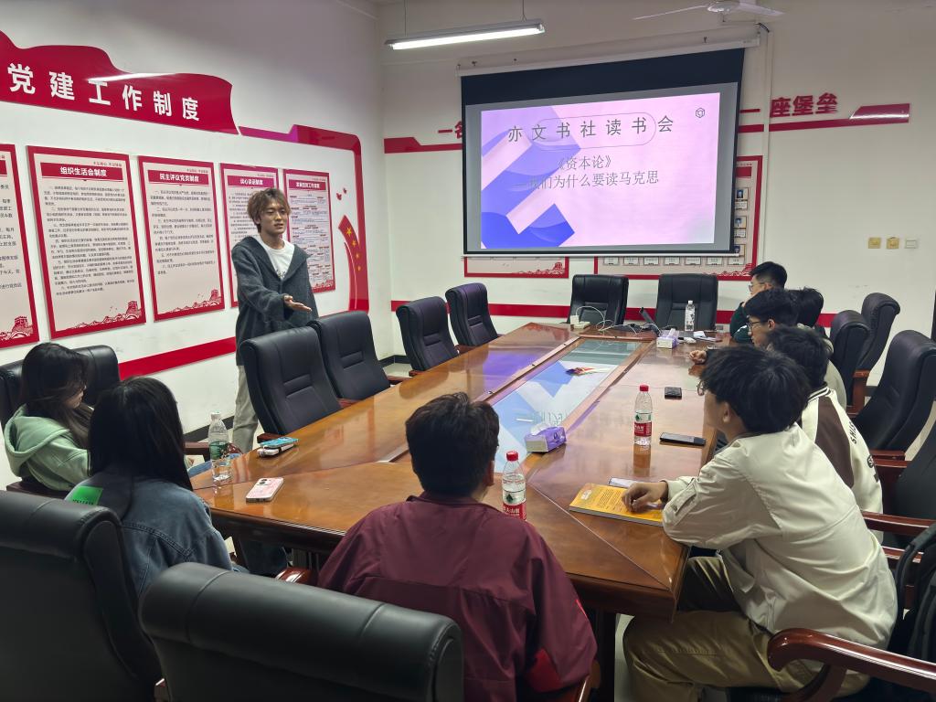 活動現場氣氛熱烈,圖書分享者孔壹萱深入淺出的對《資本論》進行了解讀,不僅剖析了《資本論》的核心理論,更結合了當下的社會現實,讓同學們能夠更直觀地理解馬克思主義在當代社會的價值和意義??滓驾鎻鸟R克思主義的歷史背景出發,講述了其產生的社會根源和思想基礎,進而深入探討了《資本論》中關于商品、貨幣、剩余價值等核心概念的分析。他通過生動的案例和生動的語言,將這些抽象的理論具象化,讓同學們能夠更好地領悟其中的精髓。在互動環節,同學們積極提問,孔壹萱耐心解答,雙方就馬克思主義在當代社會的應用和發展進行了深入的探討。