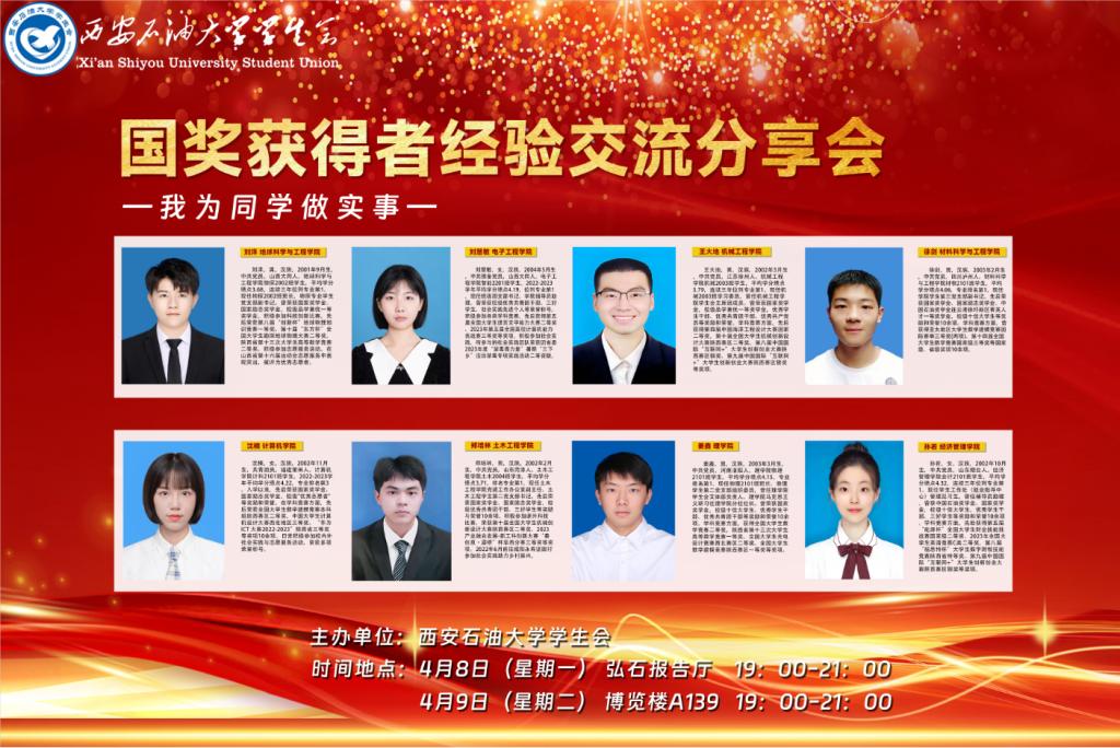為進一步加強學風建設,激發學生積極進取、勇于創新的精神,4月8日—9日,校學生會分別在鄠邑校區弘石報告廳、博覽樓A139教室舉辦國家獎學金獲得者經驗交流分享會,累計800余名學生在現場聆聽分享會。