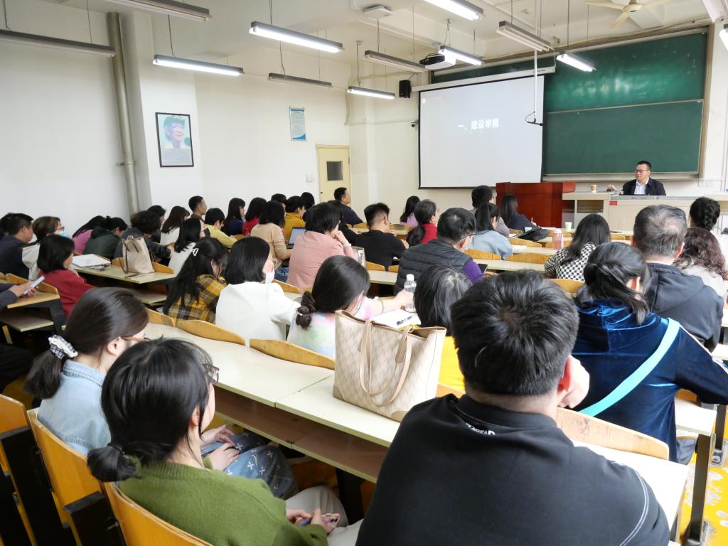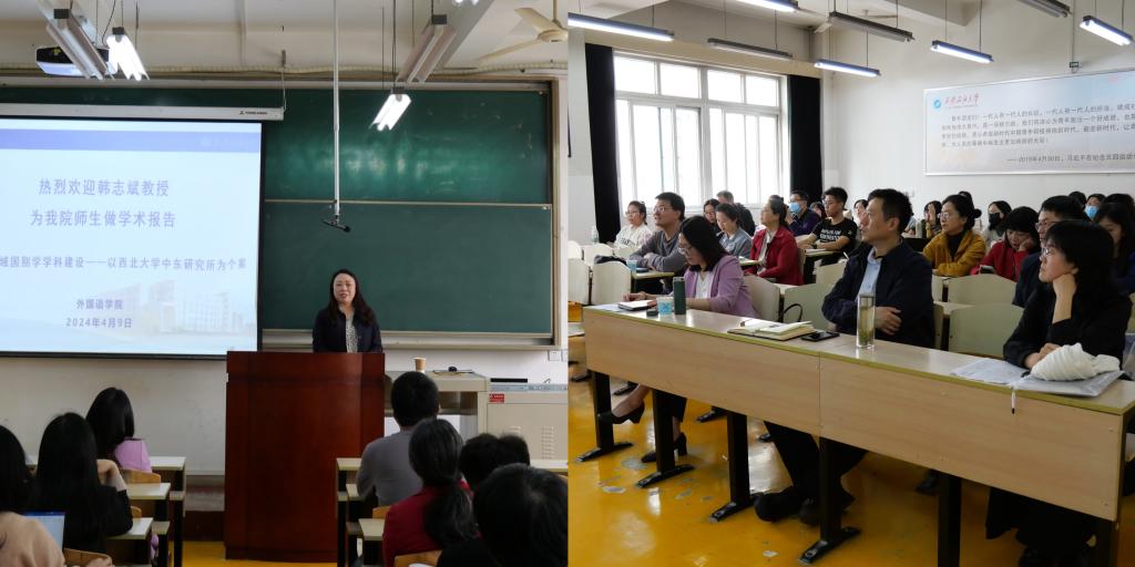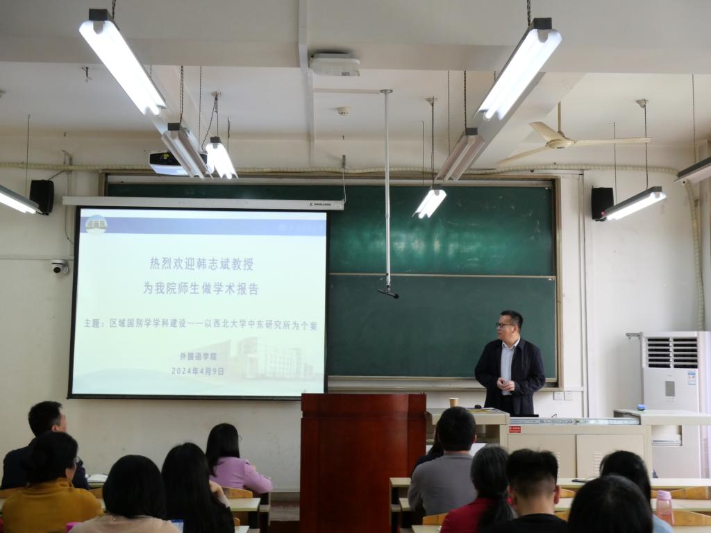 為推進我校區域國別學學科建設,2024年4月9日下午,外國語學院邀請西北大學社科處處長、中東研究所所長、博士生導師韓志斌教授,在東方石油樓1104教室,做《區域國別學學科建設——以西北大學中東研究所為個案》專題報告。學院黨委書記田虹霞、副院長劉輝、陳武、學院教師聆聽了此次報告。報告由副院長劉輝主持。