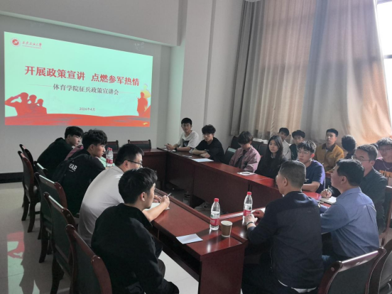 為積極響應國家號召,增強學生國防意識,激發學生愛國熱情,4月16日下午,體育學院在鄠邑校區新操場208會議室舉辦以“開展政策宣講,點燃參軍熱情”為主題的征兵政策宣講會。會議邀請學校保衛部(處)、武裝部副部(處)長袁坤主講,學院各年級有應征入伍意愿的學生近20人參加,會議由學院黨總支書記茍毅飛主持。