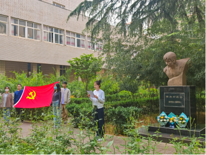 學生黨員代表周星號帶領全體師生高舉右拳,在烈士雕像前莊嚴地進行“春雨精神”宣誓活動。最后,全體師生代表默哀一分鐘,并向春雨烈士行三鞠躬禮。