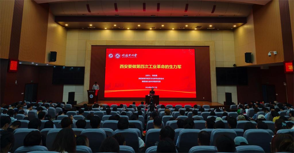 4月17日晚,由校團委主辦、共青團鄠邑區委協辦的第八十三期明德大講堂于鄠邑校區弘石報告廳舉行。陜西省城市經濟文化研究會原會長,陜西省社會科學院研究員張寶通應邀做了題為《西安要做第四次工業革命的生力軍》的講座,團鄠邑區委書記張洪雷、團鄠邑區委副書記王明、校團委書記何國強以及鄠邑區青年鄉創客代表和我校師生代表400余人在現場聆聽了報告。