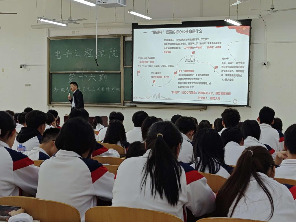 4月10日下午,電子工程學院主辦的“第十六期青年馬克思主義者初級培訓班”第四講在博思樓B121舉行。本次培訓由校團委書記何國強主講,電子工程學院團委書記錢宇航主持,200余名學員參加。