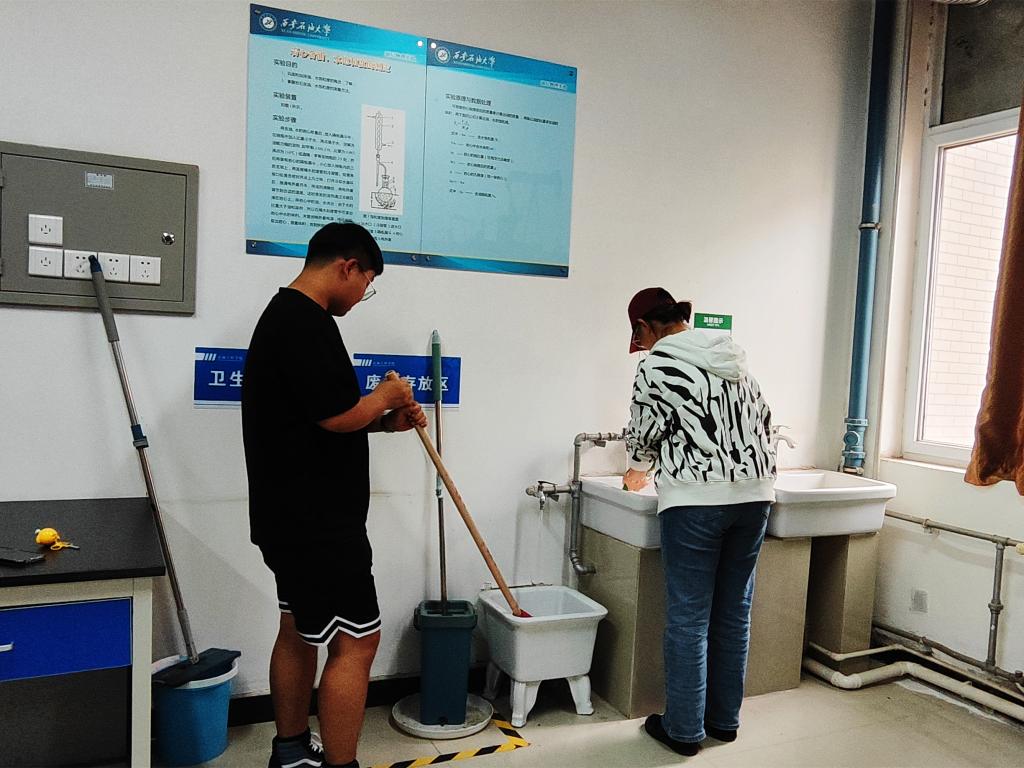 活動開始前,油藏物理實驗室的彭嬌老師為志愿者詳細介紹學院部分實驗室的功能以及相關器材的操作方式和使用目的,將教學內容與實踐操作相結合,加深學生對專業知識的了解,并強調安全事項。隨后,志愿者按組分工對實驗室進行了全面清潔,并逐個檢查衛水電安全、化學安全、設備安全,改善實驗室衛生,共筑安全屏障。最后,學院資助專干秦馨雨老師進行總結講話,對參與活動的志愿者表示感謝,并希望通過此次活動鼓勵受助學生勵志成長成才,反哺祖國和社會,傳遞正能量,充分發揮典型示范和引領作用。參與此次活動的同學獲得了學院老師們的一致贊賞。