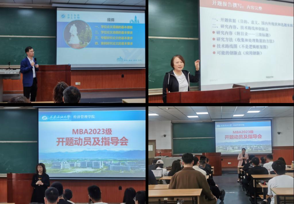 為提升工商管理碩士(MBA)學位論文質量,幫助2023級MBA同學解決論文開題過程中的疑難問題,我校MBA教育中心于5月1日上午在雁塔校區東階202教室舉行了學位論文開題動員和指導活動。經濟管理學院院長王君萍教授、副院長李春霄副教授、MBA導師吳文潔教授、MBA教育中心負責人黃莉副教授對2023級MBA同學進行了現場指導。