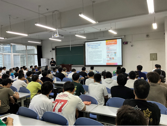 其次,王老師為同學們介紹機械工程學院一院一品活動,針對學院特色,開展“以賽促學,以賽強技,以賽提能”特色活動,并邀請鄭澤涵同學為大家分享第十屆中國研究生能源裝備大賽的特等獎經驗。王老師詳細介紹了參賽過程中的準備工作、團隊合作的重要性以及解決問題的方法和經驗。希望大家能借鑒這次經驗,提高自己的學術素養和研究能力,積極參與學術競賽,增強自身學習能力,建設學院優良學風。