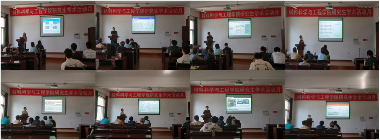 2021級研究生薛力源、王苗、李志如、鄭書權、楊培智,2022級研究生肖世俊、張國棟、張樂樂,分別作了題為《N2分壓對ZrN涂層取向和摩擦腐蝕行為及機理的影響》《S-O間非共價相互作用對非稠環受體分子光電性質的影響研究》《光誘導氧空位Bi2O2(OH)NO3的制備及其光催化性能研究》《丙烯酰甘氨酸離子凝膠的制備及在人體運動監測中的應用》《TC4鈦合金混合制造結合區組織形成機制與性能調控》《強制冷卻下大直徑薄管板殘余應力及變形分析》《大氣等離子噴涂NiCrB沉積行為研究》《TiAl合金亞穩組織析出調控及高溫氧化行為研究》的報告。