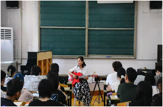 廖老師表演的時候,同學們跟著一起歌唱,音樂結束時臺下的同學們鼓掌歡呼聲不斷,老師表演激發了同學們的求知欲和表演欲。