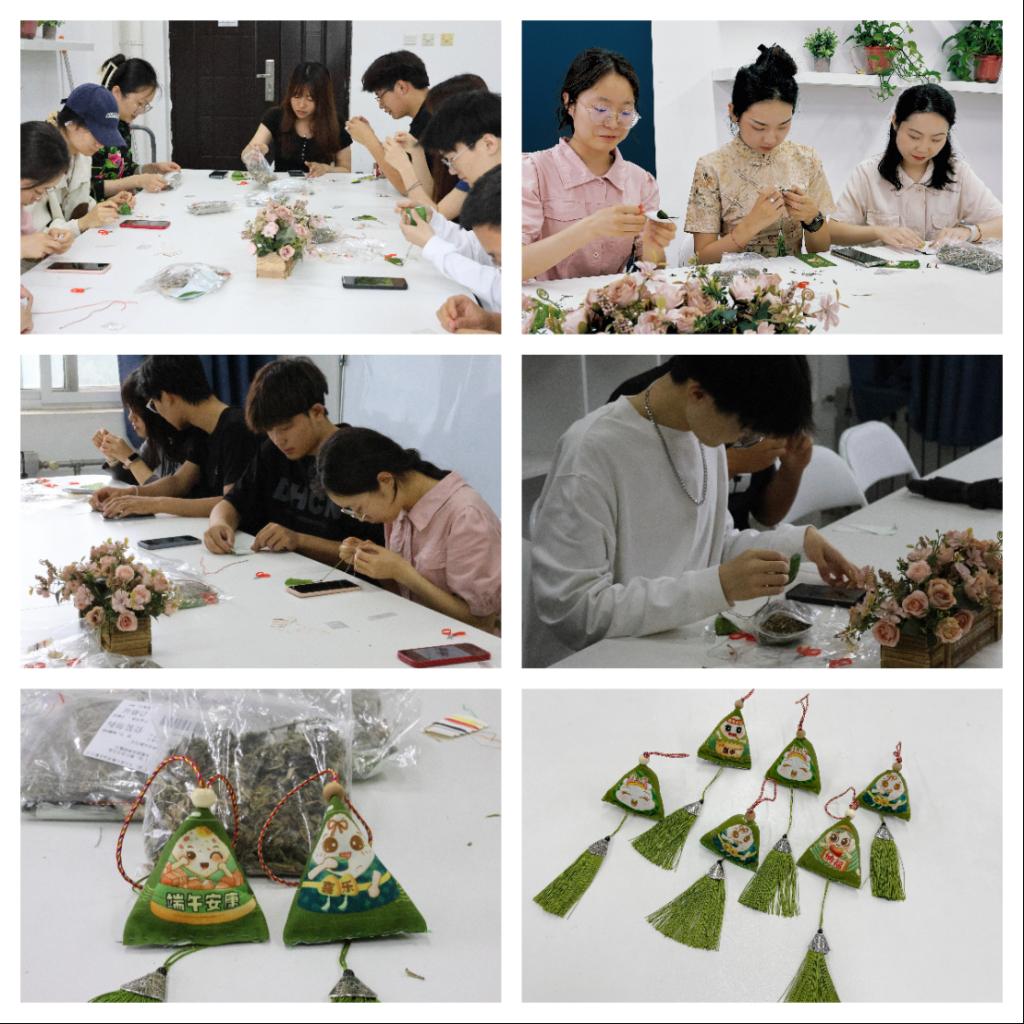 工作人員為大家介紹了端午節的由來以及習俗,耐心講解了制作香囊的傳統及方法。參與師生充分發揮動手能力,用艾草、中藥香料、麻布、五彩紗線以及各種配件,有條不紊地按照步驟親手縫制香囊。從穿針引線到填充香料再到釘穗收尾,大家互相分享著制作香囊的經驗,一針一線,一個個獨一無二、精致飽滿的香囊呈現在眼前。在沉浸式體驗香囊制作的過程中,同學們不僅收獲了傳統手工藝的樂趣,傳承了香包制作的傳統習俗,更感悟到中華傳統文化的魅力。