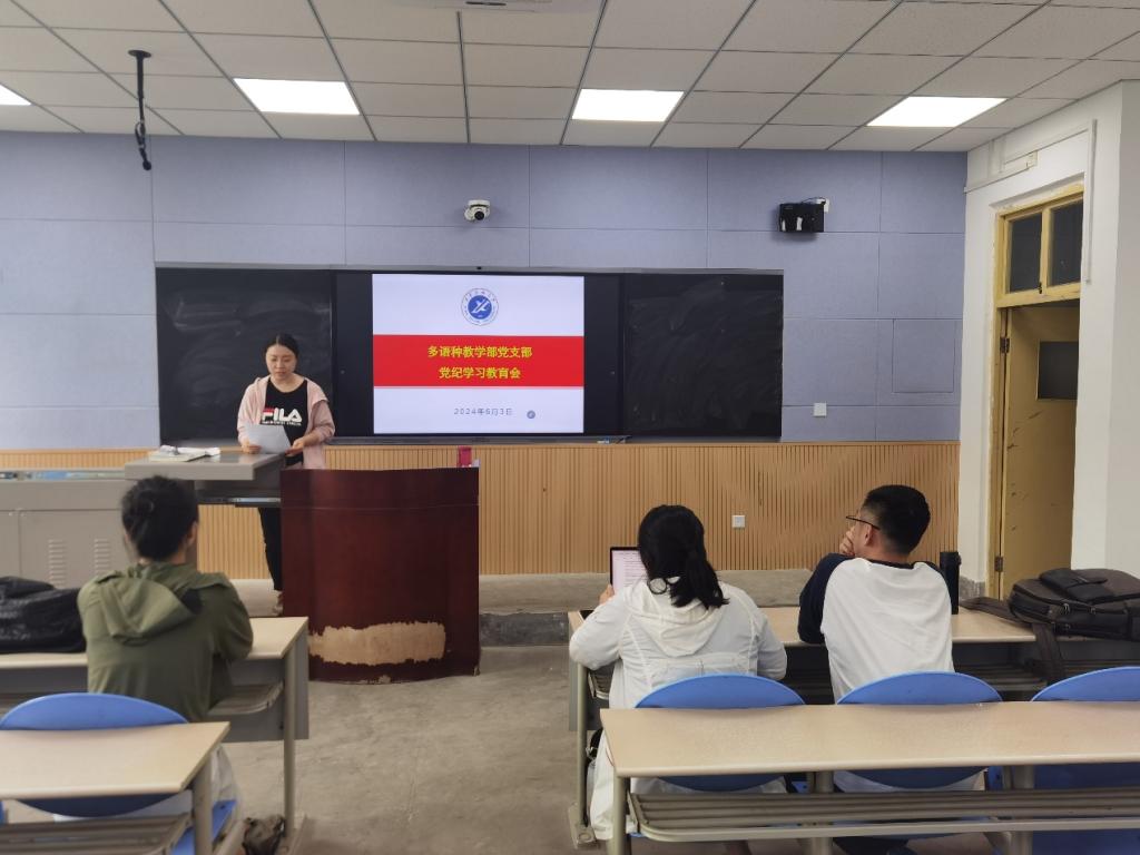 為進一步貫徹落實學院黨委關于開展黨紀學習教育和教職工政治理論學習工作部署,6月3日,外國語學院多語種教學部黨支部在鄠邑校區A215教室開展了黨紀學習教育。會議由黨支部書記吉玲主持,多語種教學部黨支部全體黨員參加會議。