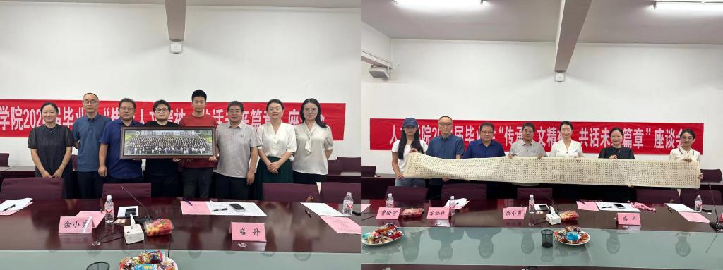 座談會后,畢業生們向學院贈送2024屆全體本科畢業生合影,畢業生夏妍月向學院贈送書法長卷作品《大學》,領導老師向畢業生贈送紀念禮物。