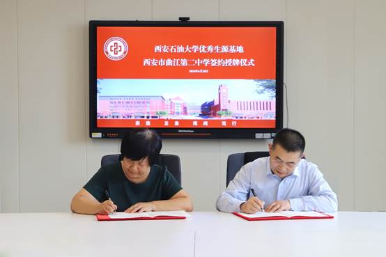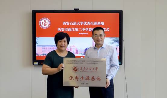 龐秉謙書記與朱琳瑛校長簽署了西安石油大學優秀生源基地建設協議,并授予“優秀生源基地”牌匾。