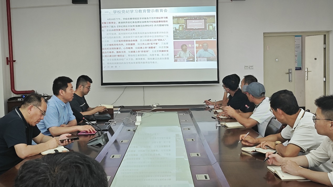 李慶本首先向與會黨員傳達了學校6月13日召開的黨紀學習教育警示教育會相關精神,介紹了陜西省紀委監委駐省教育廳紀檢監察組組長趙軍所作的題為《學紀律處分條例 做廉潔自律標桿》專題輔導報告會相關內容,學習了趙軍組長關于高校領導干部在履行職責中應該做到的五個方面要求以及校黨委書記常江就進一步推動學校黨紀學習教育和“三風”建設工作走深走實提出的三點意見。