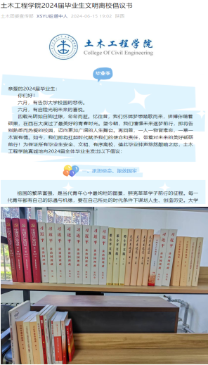 倡議:為加強學院黨建辦公室讀書角建設,6月8日,土木工程學院面向41名畢業生黨員發出了“我為學院捐贈一本好書”倡議,為學院建設做出綿薄之力。為了讓畢業生能明確畢業流程和知悉相關注意事項,確保順利離校,6月15日,學院面向全體畢業生發出了“土木工程學院2024屆畢業生文明離校倡議書”,號召全體畢業生,牢記習近平總書記對廣大青年的囑托,爭做有理想、敢擔當、能吃苦、肯奮斗的新時代好青年,在推進強國建設、民族復興偉業中展現青春作為、彰顯青春風采、貢獻青春力量,奮力書寫為中國式現代化挺膺擔當的青春篇章。