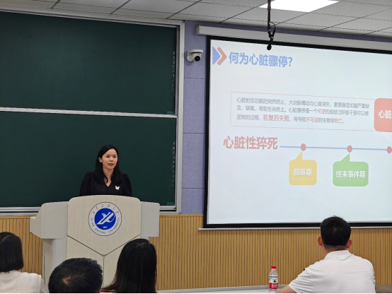 培訓以“理論授課+動作示范+現場實操”的形式展開。“發現有人倒地,四周環境安全;意識喪失呼不應,馬上撥打120,拿取ADE……”問芳芳副主委用通俗易懂的語言,通過制作精美的PPT課件,為同學們耐心地講解現場心肺復蘇基本操作與氣道異物梗阻急救的實施方法與步驟,并通過現場“手把手”對大家如何進行外傷包扎規范化操作示范與指導,使他們真正地掌握心肺復蘇術操作與外傷包扎止血的流程和要點,從理論學習到實際應用,確保每一位同學真正學會常見的急救技能。