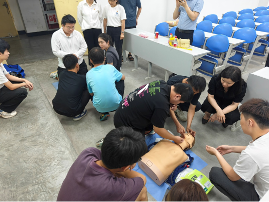理論授課、動作示范后,現場救護專業委員會團隊分成3組利用人體模型對同學們手把手進行現場實操培訓,同學們踴躍參與到實踐操作中來,親身體會心肺復蘇術操作中患者意識的判斷、體位的擺放、按壓的深度等細節問題,真正讓參與培訓的每一個同學都掌握急救技能。