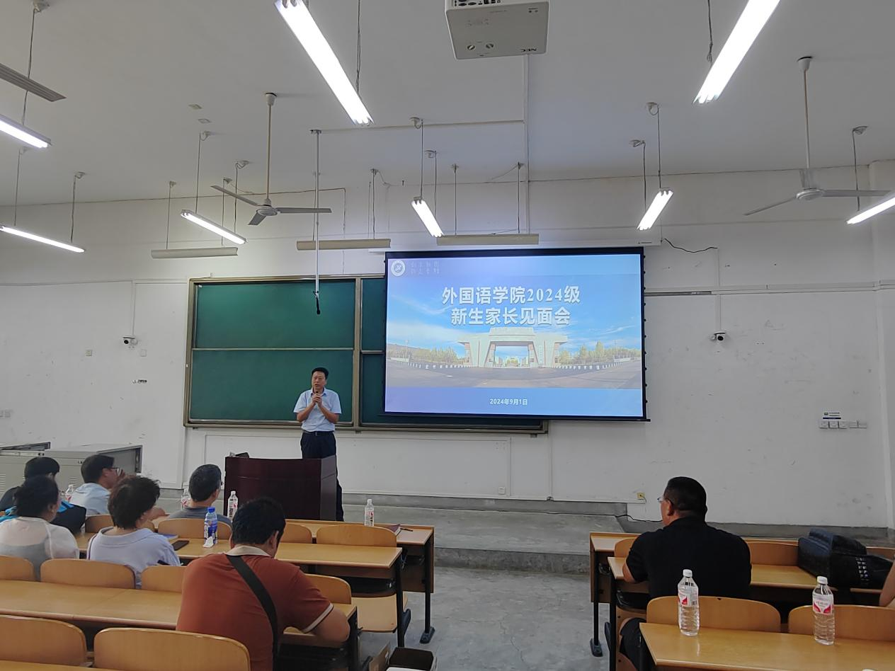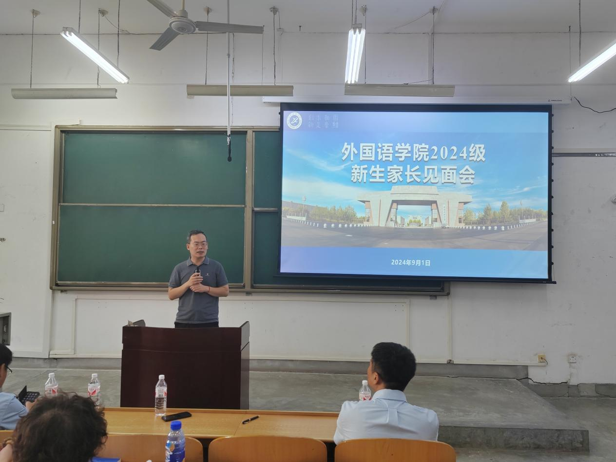 9月1日下午,外國語學院在鄠邑校區博思樓112教室召開2024級本科生新生家長見面會。學院黨委書記張建高、副書記王業青、副院長陳武、輔導員陳浩及新生家長參加會議。會議由學生工作辦公室主任周宇主持。