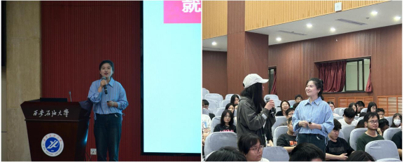 白又竹回顧了自己在西安石油大學七年的求學成長歷程,分享了從校園到職場的轉變過程、面對困難和挑戰時的堅持與勇氣,以及取得成就時的喜悅與自豪,并結合自身的學生干部經歷與實踐實習經歷,從就業方向選擇、求職心理、撰寫簡歷、面試準備、職業規劃、實習感悟等方面分享了經驗。她強調,大學生要正確認識自己,明確人生計劃和職業規劃,在校期間要注重信息搜集整合、資源積累和職業能力儲備,多途徑提高專業技能和綜合素質。同時,她希望學弟學妹們能夠通過提高行動力來克服就業壓力和焦慮,主動學習獲取相關職業技能證書,保持良好心態,大膽向招聘企業投遞簡歷,豐富自身的面試求職經驗,加強和老師、學長溝通,獲取更多實習或就業機會。在互動環節中,現場學生積極提問,白又竹耐心解答,針對同學們提出的關于就業選擇、職業發展路徑等問題,給出了切實可行的建議和指導。