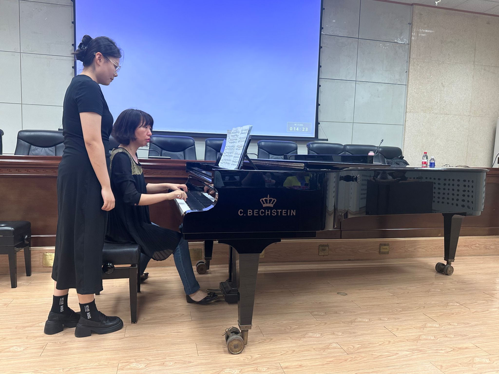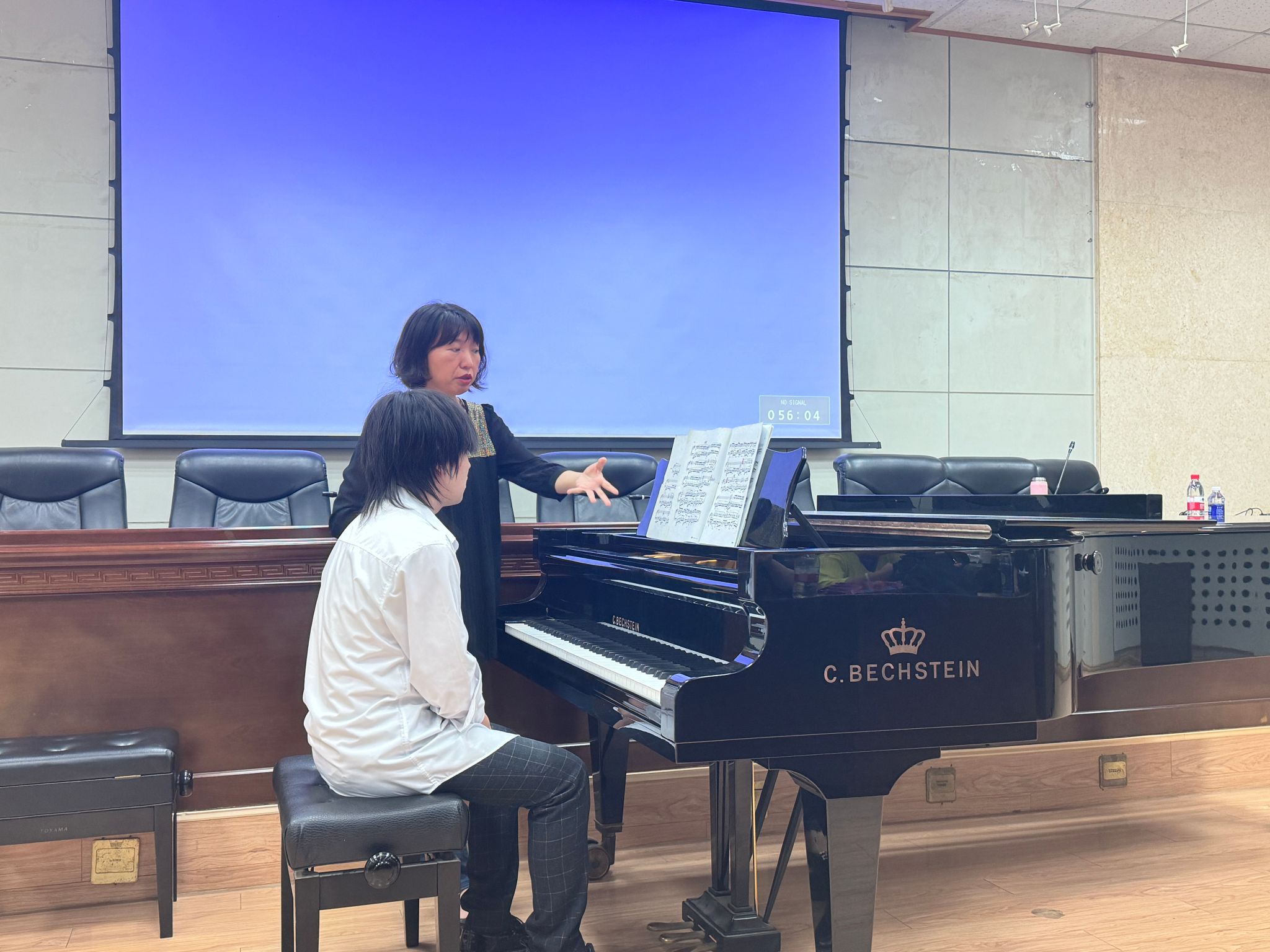 鋼琴學術講座的后半段是鋼琴教學實踐活動。第一位龔海軍同學演奏的是拉赫瑪尼諾夫《音樂瞬間》,劉玉茹老師用豐富的教學經驗細致的給講解了樂句的旋律特點,節奏變化 ,每一個細節都被反復強調和練習,指導如何在鋼琴上準確地詮釋出拉赫瑪尼諾夫獨特的音樂風格。第二位同學袁馨怡演奏的是《新疆隨想回旋曲》,劉老師針對曲子中的高難度段落進行了細致入微的分析和示范,從快速的音階跑動到復雜的節奏把握,再到雙手的協調配合,每一個細節都被精準的拆解和演示。手把手的指導學生如何彈出作品的音樂風格。