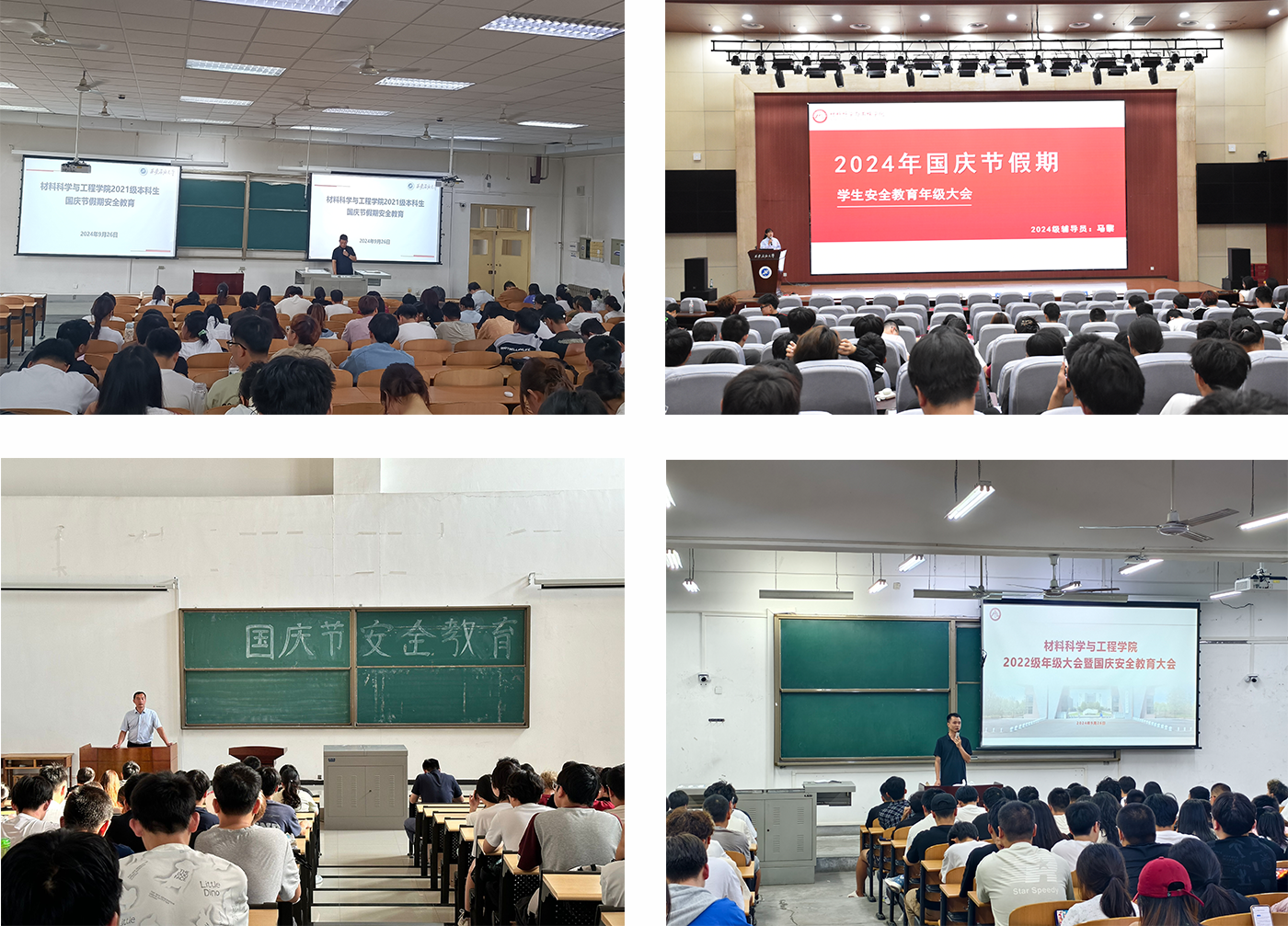 為切實做好國慶假期學生安全教育工作,提高學生安全意識,材料科學與工程學院各年級于2024年9月24日-29日分別召開國慶節前安全教育大會。會議由各年級輔導員主持,全體學生參加會議。