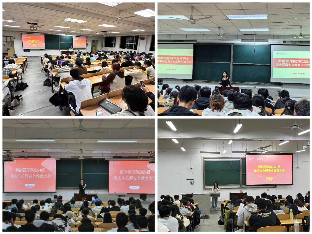 ——全面安全教育。29日,各年級相繼組織召開年級/班級安全教育大會。輔導員和班主任重點圍繞消防安全、交通安全、校園安全、網絡安全、人身安全和心理安全等方面對學生進行安全教育,結合校園案例和實用安全知識,引導學生增強自我保護意識,避免潛在危險。輔導員還組織全體學生簽署了《新能源學院國慶假期安全承諾書》和《新能源學院國慶假期去向登記表》,全面掌握假期學生動向。