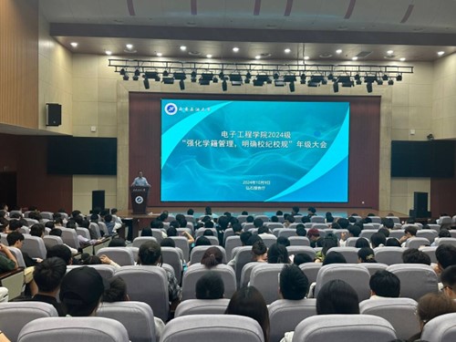 為幫助2024級學生學習理解學生管理相關制度,教育引導學生們養成良好的學習生活習慣,10月9日下午,電子工程學院在鄠邑校區弘石報告廳召開“強化學籍管理、明確校規校紀”教育會。學院黨委副書記芮執根、教學辦公室主任張漪、2024級輔導員沈軒羽、帕麗達·托乎提及2024級全體學生參加會議。