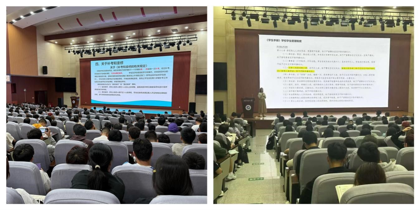 會上,張漪依據《西安石油大學全日制本科生學籍管理規定》,分別從學籍管理、課程考核、成績記載、課程修讀、學業預警與留級、學籍異動等多方面進行了詳細的講解,引導學生正確對待學業,合理規劃大學生涯。沈軒羽就《學生手冊》中的各項規章制度進行了詳細解讀,重點介紹了校規校紀、資助政策、評獎評優等內容,引導新生把外在的約束內化為自覺的行為,鼓勵同學們規范言行,向上向好發展。
