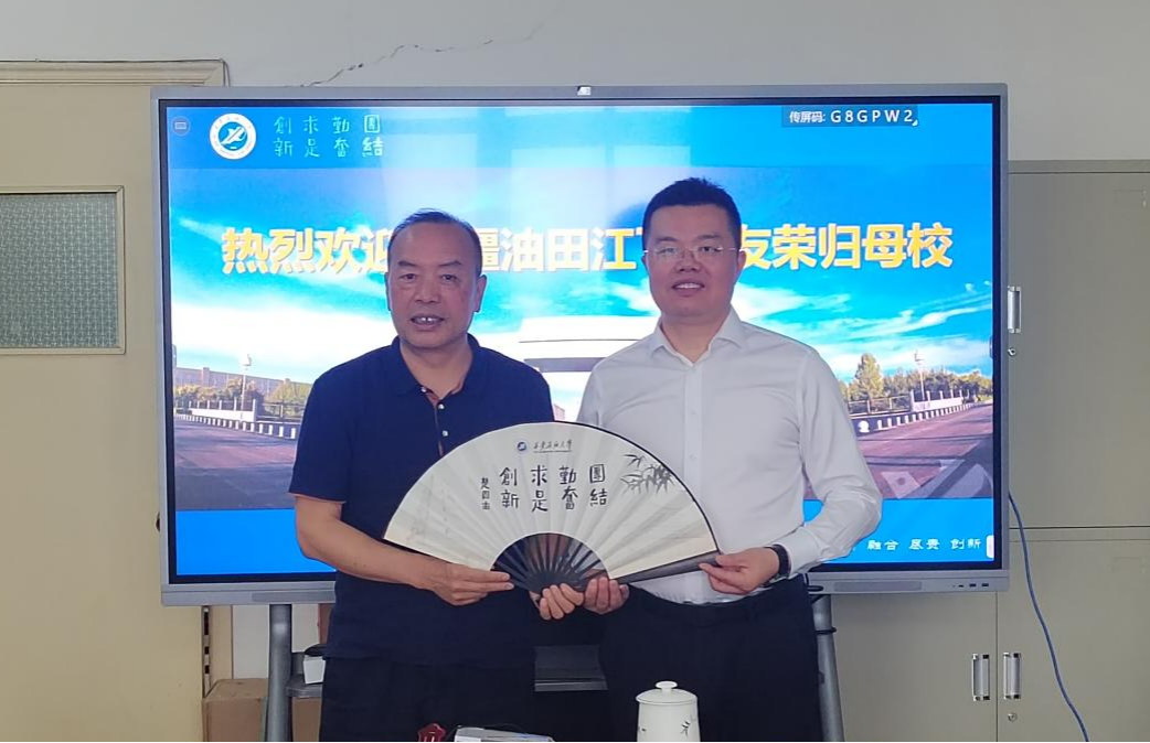 談建勤書記做了總結發言,他期望江飛校友和其他校友一道加強與母校、學院的聯系交流,積極促成與母校各項合作業務開展,不斷拓寬合作領域,共同為油田及母校事業發展做出應有的貢獻。談建勤還向江飛校友贈送了紀念品。