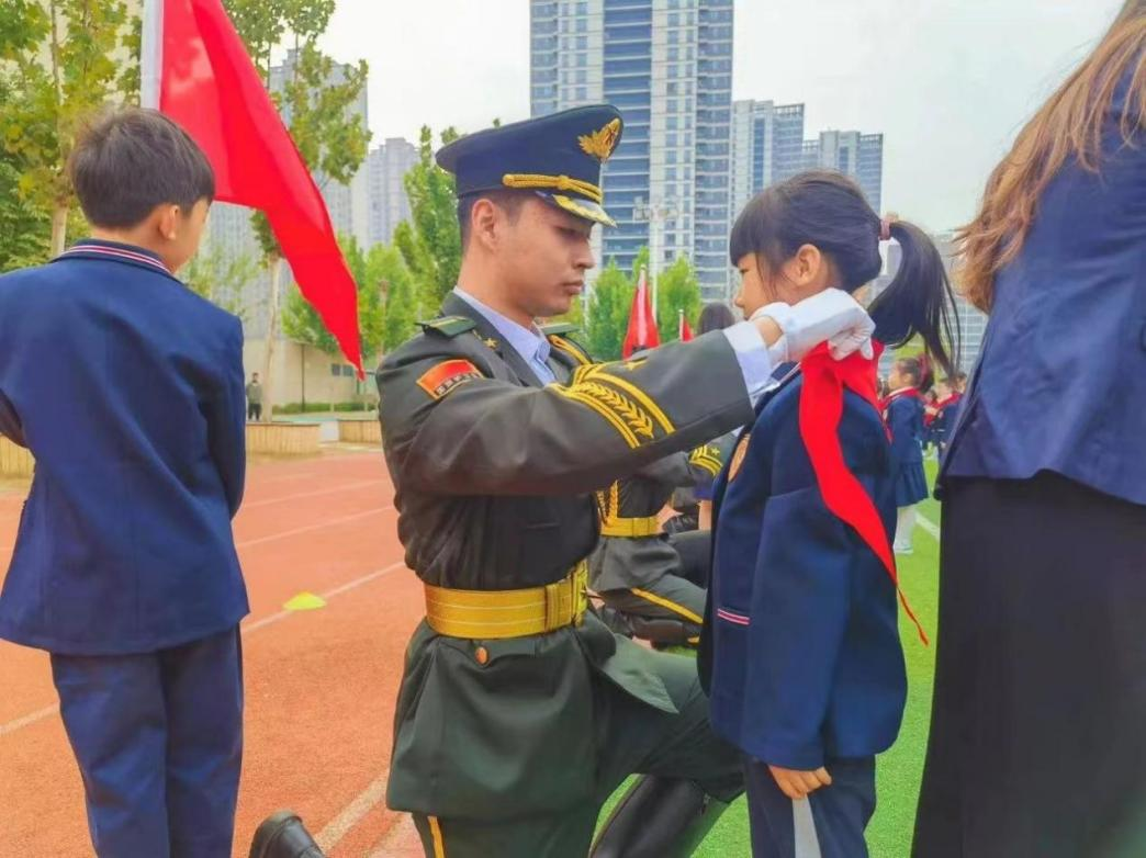 校領導、家長代表、中隊輔導員以及我校退役大學生士兵代表為新入隊少先隊員佩戴紅領巾,新隊員們此刻肩負起了傳承紅色基因、弘揚愛國精神的重任。