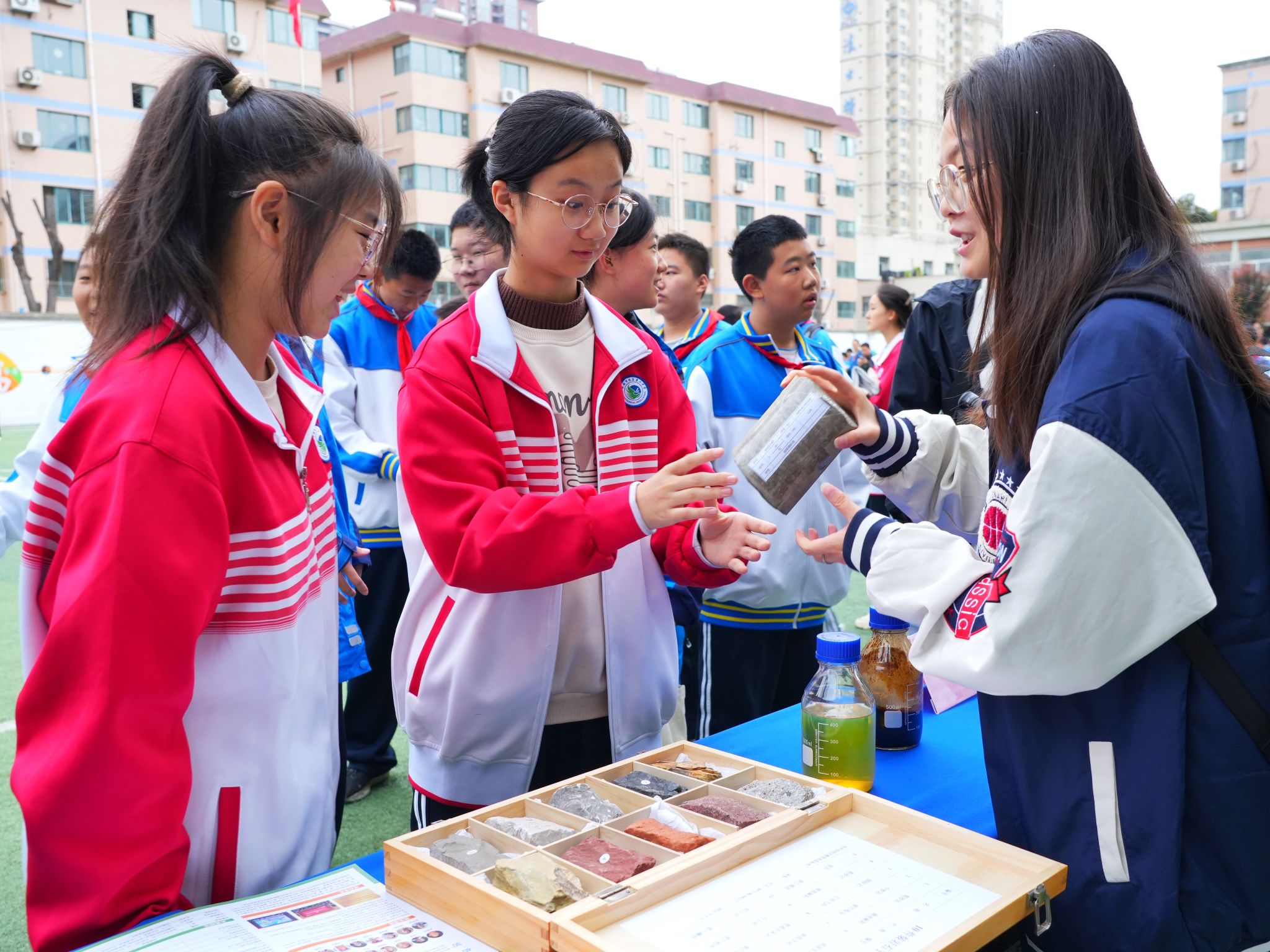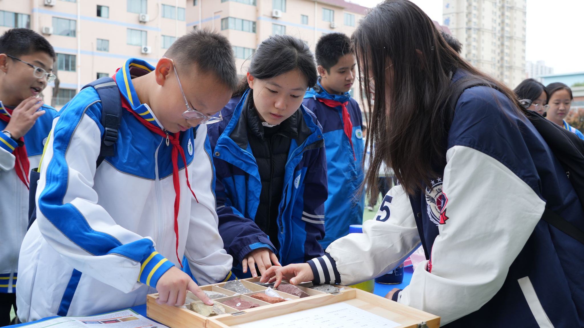 活動現場,科普志愿者正在向同學們講解巖石標本
