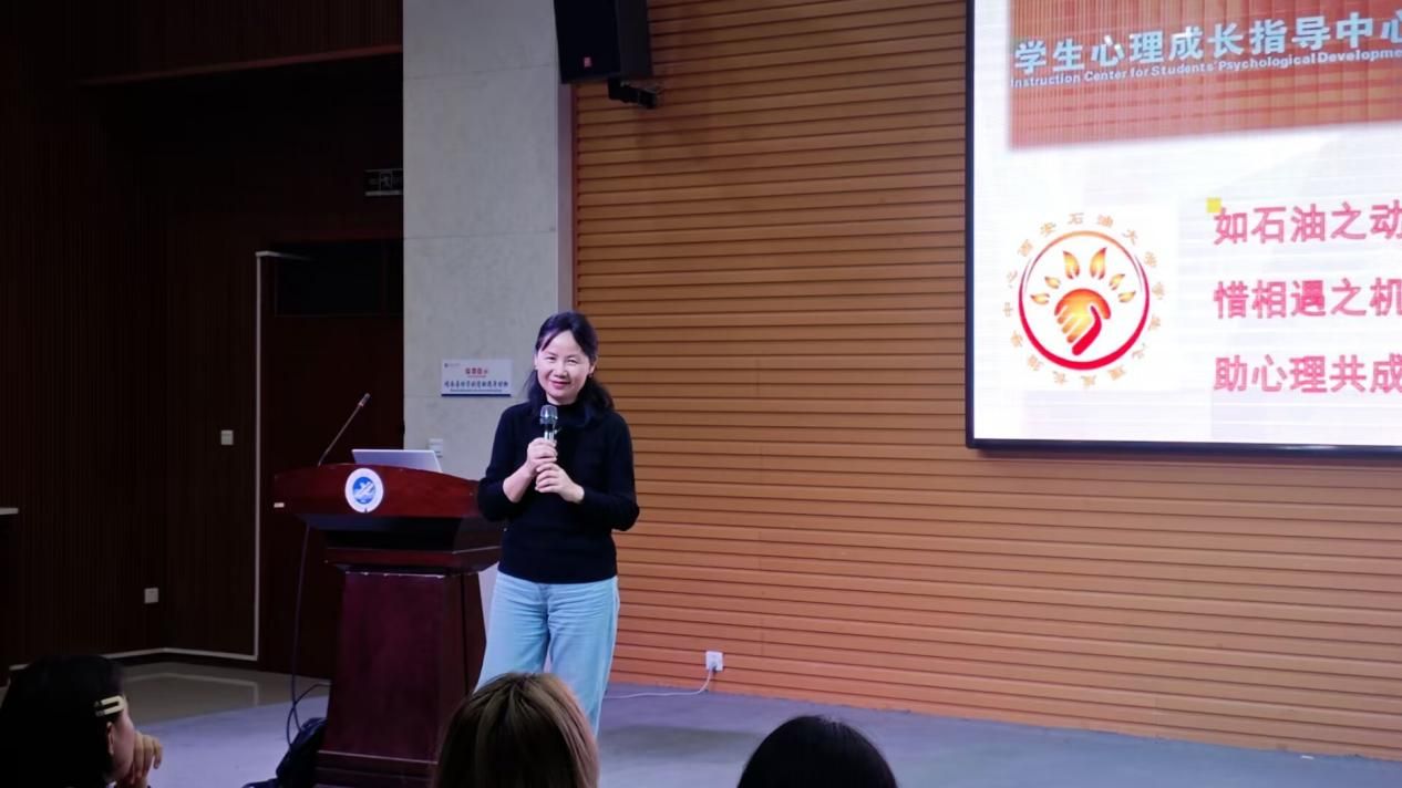 培訓活動以“握手”、“言歡”熱身開場,活躍了現場培訓氣氛,大家進入了比較輕松愉悅的狀態。隨后,肖瓊老師介紹了“油緣”心理的“如石油之動力、惜相遇之機緣、助心理共成長”的文化理念,學生心理成長指導中心的場地、設備、人員及咨詢預約方等。