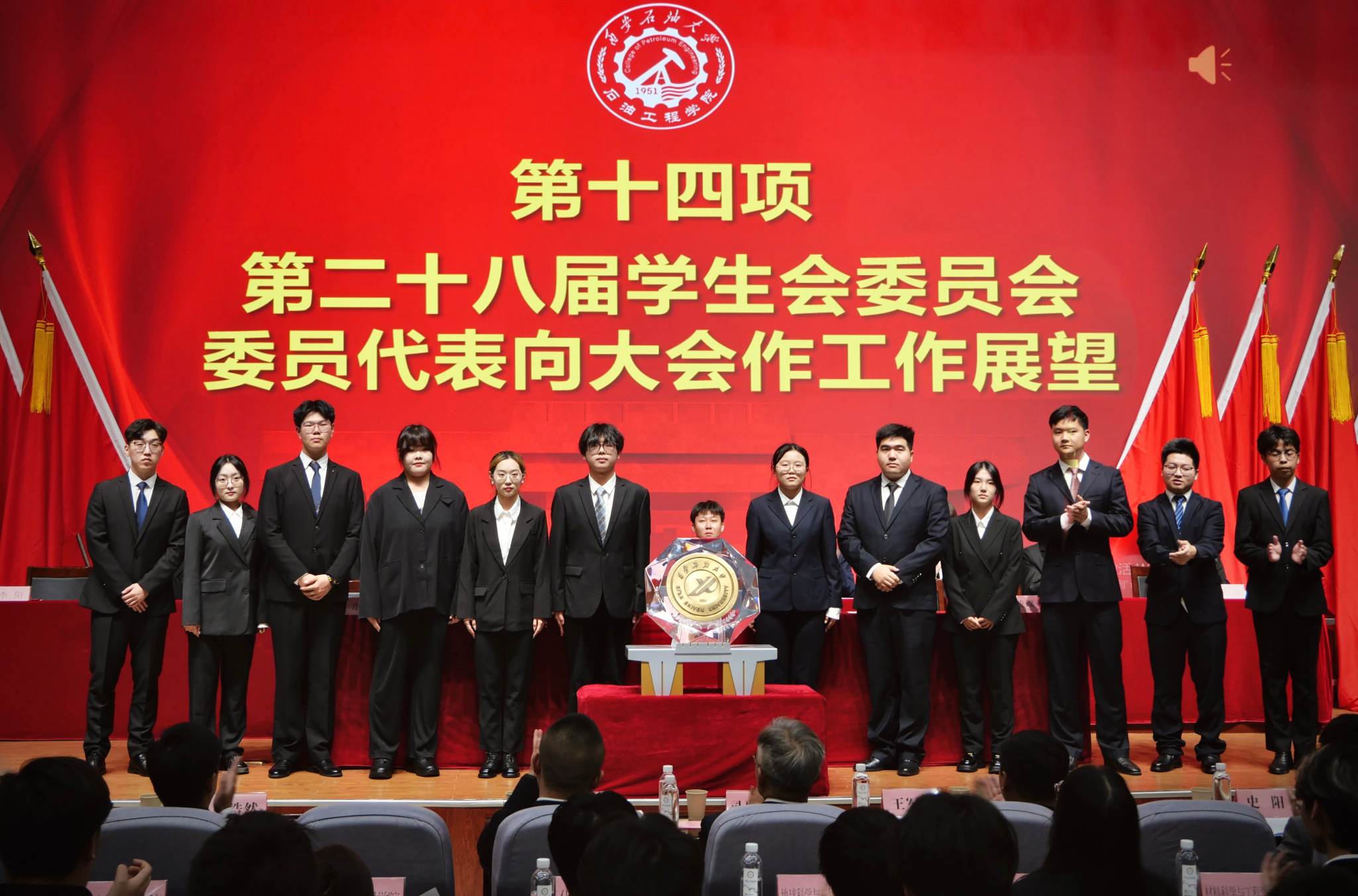會前,播放了學院團學工作風采視頻。大會圓滿完成各項既定任務,在?;盏囊娮C下通過民主投票選舉產生了石油工程學院新一屆學生會委員會,并公布了石油工程學院新一屆學生會部門負責人名單。石油工程學院第二十八屆學生會全體成員,在學生工作辦公室副主任史陽的帶領下,面向國旗就職宣誓。第二十八屆學生會委員會代表李陽向大會作工作展望,新一屆學生會委員會委員依次上臺與上屆學生會委員會委員握手致謝并合影留念。最后,大會在全場齊唱的《我為祖國獻石油》中落下帷幕。