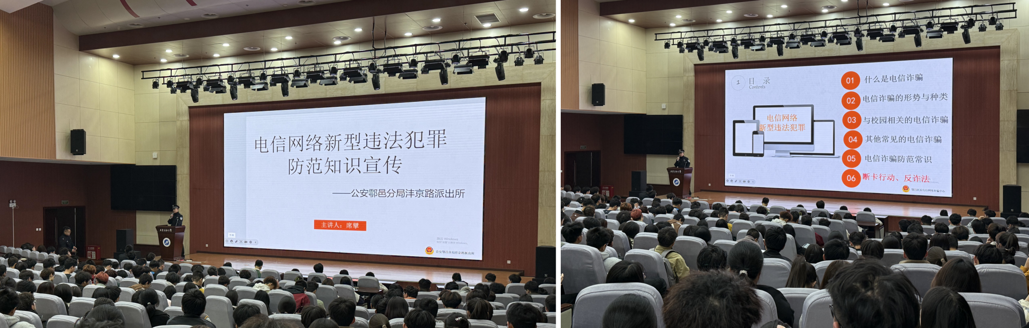 講座中,席擘警官以豐富的工作經驗和深厚的專業知識,深入淺出地講解了當前電信網絡詐騙的新趨勢、新特點。他通過列舉一系列鮮活的案例,如冒充公檢法詐騙、網絡購物詐騙、冒充親友詐騙等,詳細分析了詐騙分子的作案手法和受害者的心理變化,使在場師生深刻認識到詐騙的隱蔽性和危害性。席警官不僅講解了識別詐騙的技巧,如核實信息來源、警惕異常要求、保護個人隱私等,還強調了遇到詐騙時應采取的正確應對措施,如立即掛斷電話、不輕易轉賬、及時報警等,確保師生在遇到類似情況時能夠迅速反應,有效避免損失。講座現場氛圍活躍、互動頻繁,最后席警官提醒大家在日常生活中謹防電子詐騙,同時呼吁大家從自身做起,共同構建安全的網絡環境。