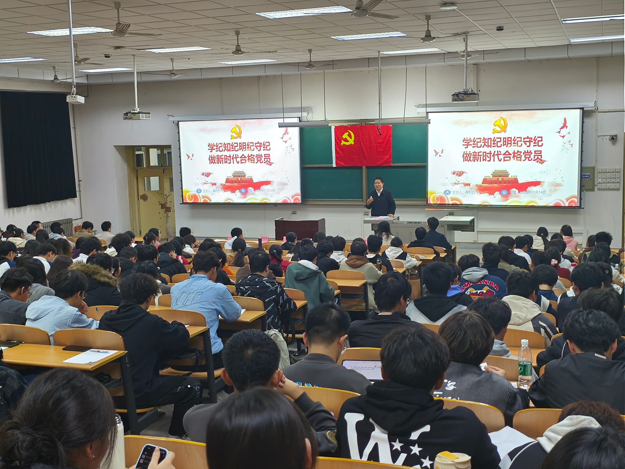 開班儀式后,理學院黨委書記席利哲作了培訓班第一講。他以《學紀知紀明紀守紀,做新時代合格黨員》為主題,通過與多名同學互動提問的方式深入淺出地講解了新時代合格黨員的標準和內涵,一要講政治、有信念,確保在鑄魂立根上合格;二要講規矩、有紀律,確保在遵規守紀上合格;三要講道德、有品行,確保在崇德修身上合格;四要講奉獻、有作為,確保在干事創業上合格。他指出,學紀、知紀、明紀、守紀是每個黨員的必修課,學紀是基礎,知紀是前提,明紀是根本,守紀是關鍵,要深刻認識黨的紀律在教育引導、警示預防、懲戒糾錯方面的功能,自律和他律相結合的實質,以及加強黨的紀律建設的重要性。他為全體參訓學員解讀了《中國共產黨紀律處分條例》的主要內容和負面清單,以典型案例生動詮釋了黨的紀律的嚴肅性和權威性。最后,他鼓勵大家努力學習,爭取早日入黨,把遵規守紀內化為思想和行動自覺,敬畏法紀,從小事做起,在日常堅守,以新時代合格黨員的標準嚴格要求自己,跑好中國式現代化的接力棒,在民族復興的宏偉征程中寫就青春的華彩篇章。