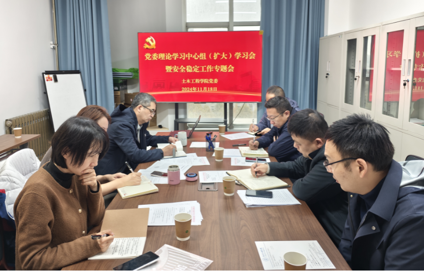 11 月 18 日,土木工程學院黨委召開2024年11月理論學習中心組(擴大)學習會暨安全穩定專題會,學院理論學習中心組成員及各辦公室主任、實驗室主任和系主任參加會議。會議由學院黨委書記賈莉娜主持。