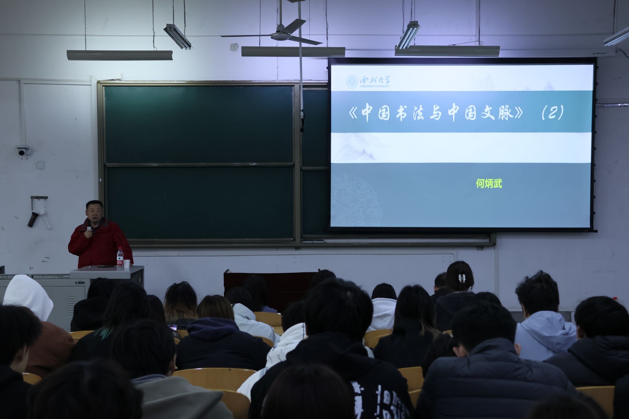 捐贈儀式結束后,何炳武先生在我校鄠邑校區博思樓B112教室為師生作了題為《中國書法——中華文脈與文化自信》的專題講座。人文學院院長方亭、副院長方松林、視覺傳達設計專業帶頭人周鳴勇以及學校150余名本科生、研究生參加該講座,講座由人文學院方亭院長主持。